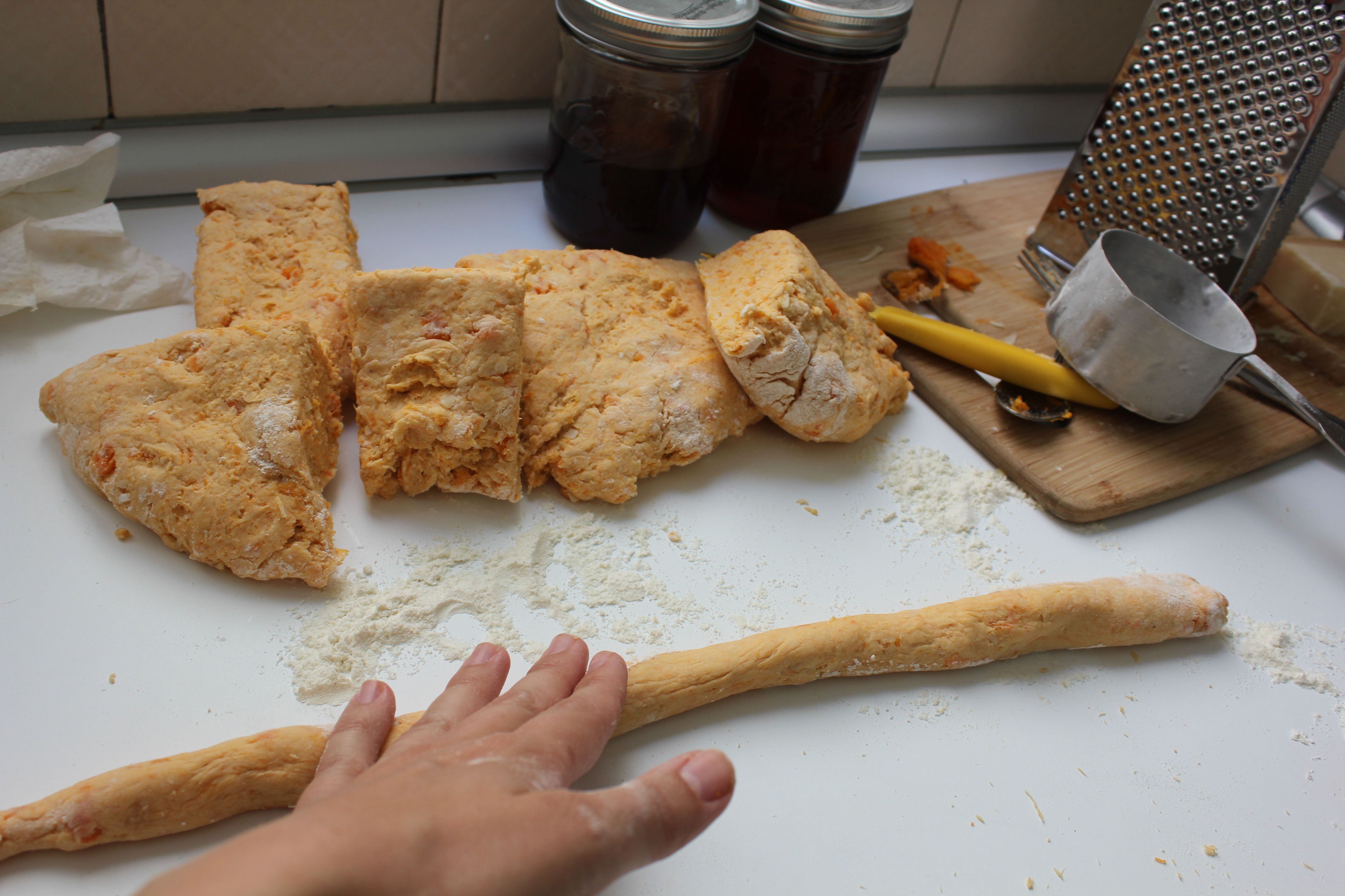 Rolling the gnocchi into ropes.